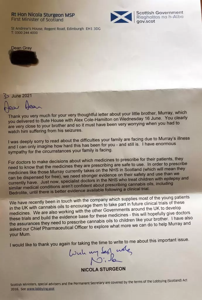 Dean Gray wrote to Scotland’s First Minister in June to ask for help with the costs of brother Murray’s Bedrolite prescription.